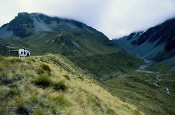 ![]() Helicopters parked on a glacial moraine terrace running along the side of Whale Stream valley |