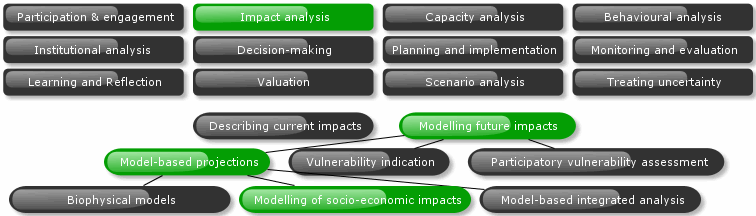 | Impact assessment (scenario based assessment) | Physical effects and economic costs of CC with sectoral models in future periods, and costs and benefits of adaptation or in costeffectiveness analysis | Multi-sectoral PESETA study (Ciscar et al., 2009). National scale: Flooding in the UK (Thorne et al., 2007) and Finland (Perrels et al., 2010) | More sector specific analysis. Provides physical impacts as well as economic values – therefore can capture gaps and non-market sectors. | Not able to represent cross-sectoral, economy-wide effects. Tends to treat adaptation as a menu of hard (technical) adaptation options. Less relevant for short-term policy. |