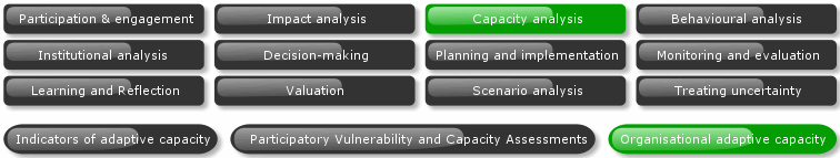 | Adaptation Wheel, IVM | A diagnostic tool for organisational and sectoral capacity assessment designed to examine an institution’s strengths, weaknesses and opportunities for improvement. Adaptive Capacity Wheel shows the inherent capacity of an institution to respond to change. It is proposed that institutions capacity to address climate risk fall into six dimensions: variety, learning capacity, room for autonomous change, leadership, resources and fair governance. | Three case studies in Zaanstad,Wijdewormer and Delft were undertaken to study how local actors perceive the division of responsibilities between the state and themselves with respect to water management. http://www.ess.wur.nl/UK/Products+ and+Results/The+Dutch+institutional+ framework+and+governance+of+ adaptation+strategies/ |